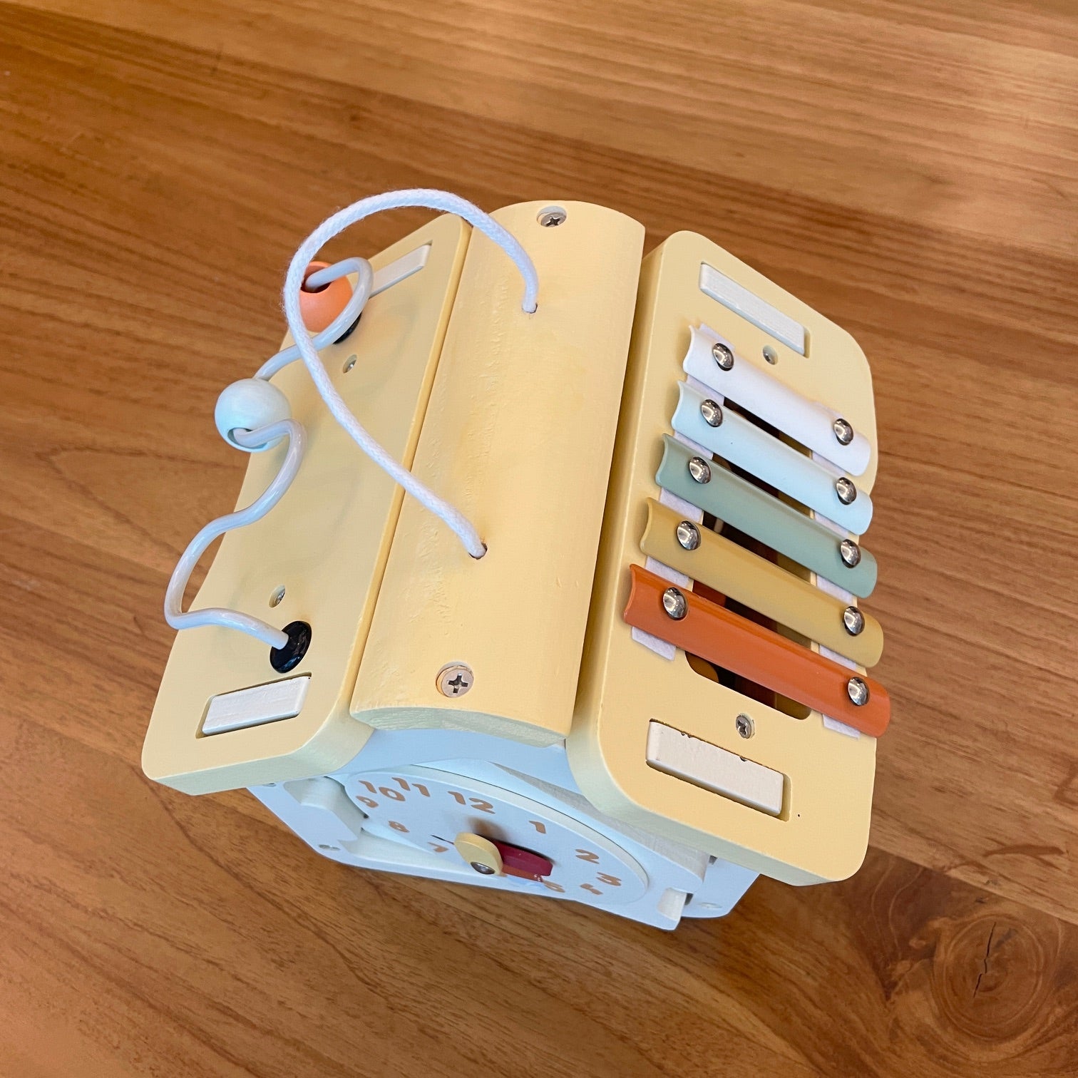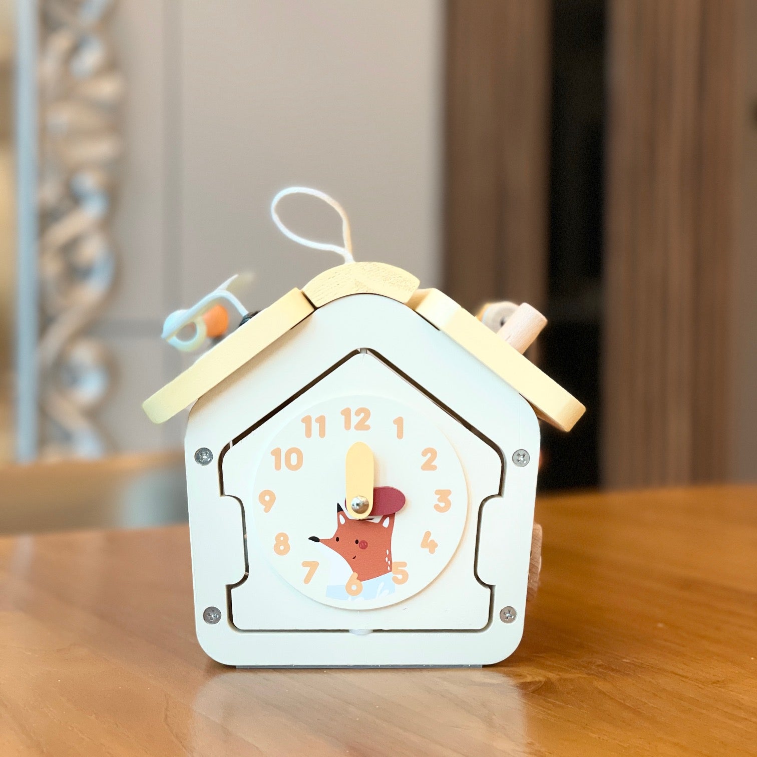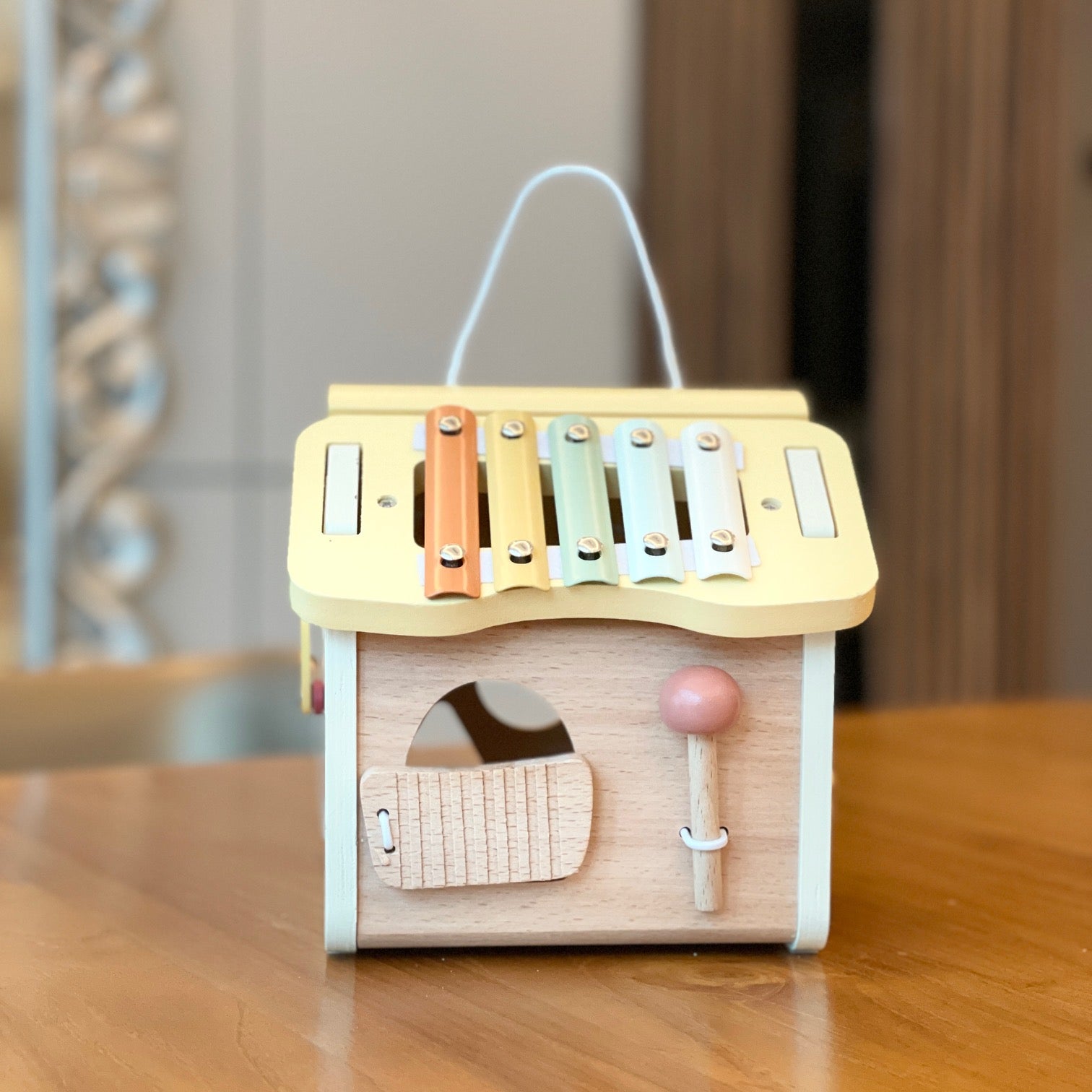 Mainan edukatif kayu berbentuk rumah ini dilengkapi berbagai aktivitas seru: jam belajar, xylophone, mur-baut putar, manik-manik geser, dan shape sorter.